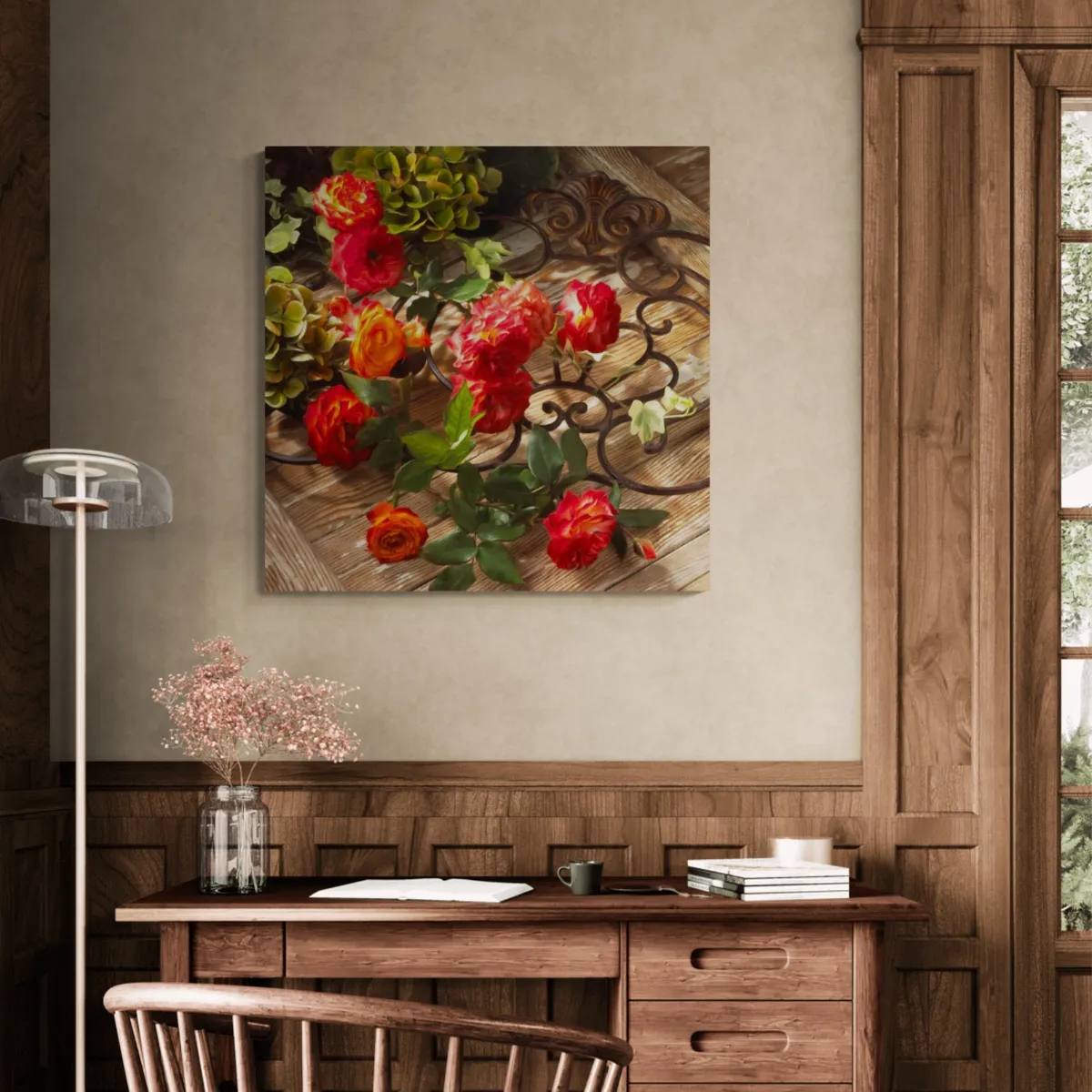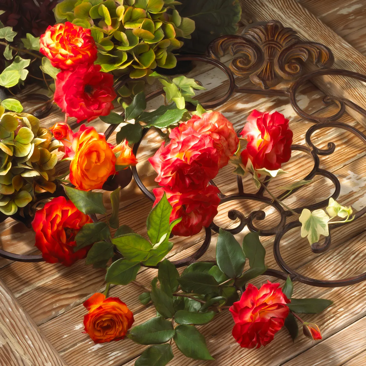 Photograph of beautiful grouping of roses on rod iron with rustic wood setting