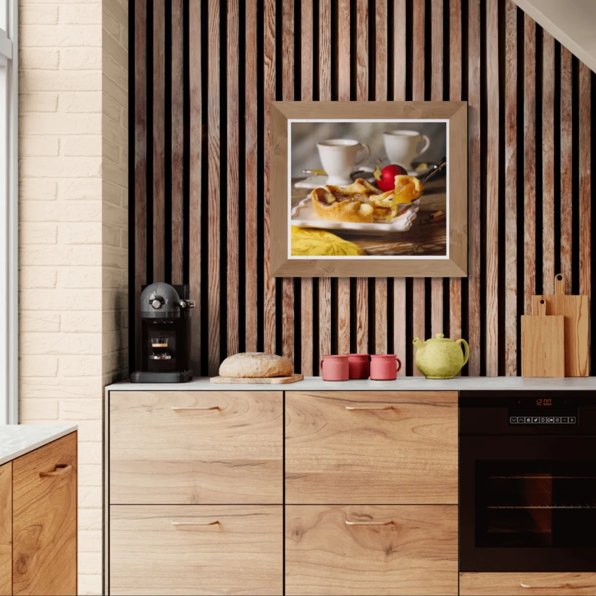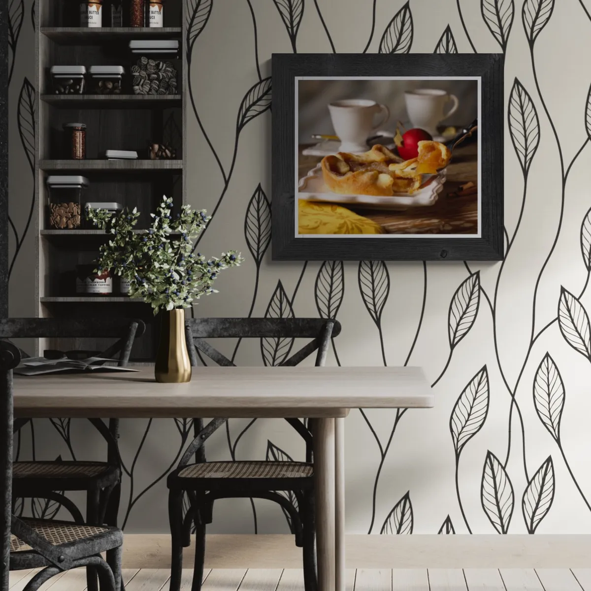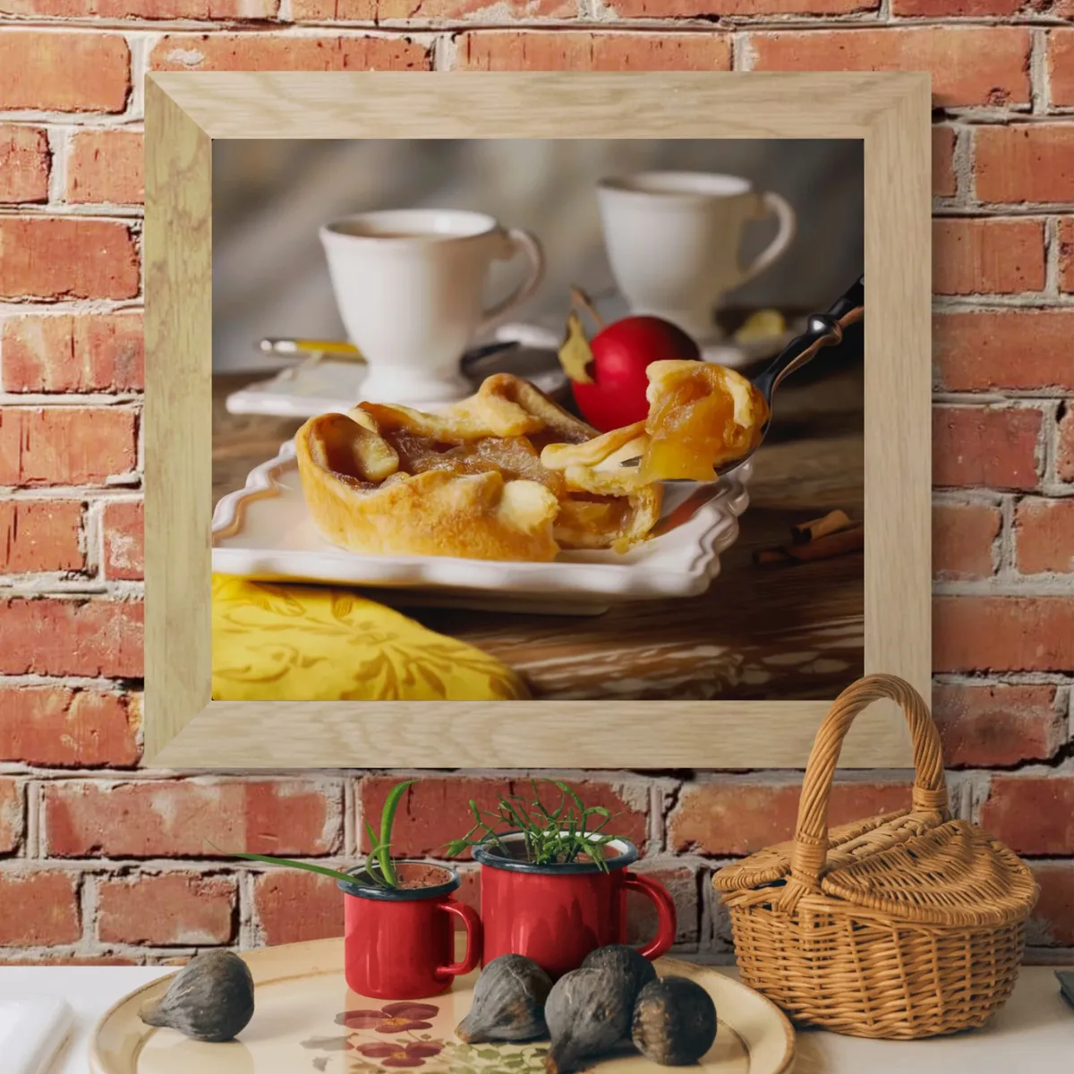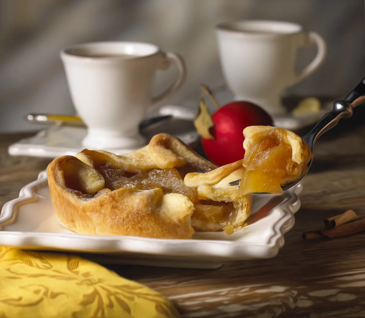 Apple pie with tea cups in rustic setting